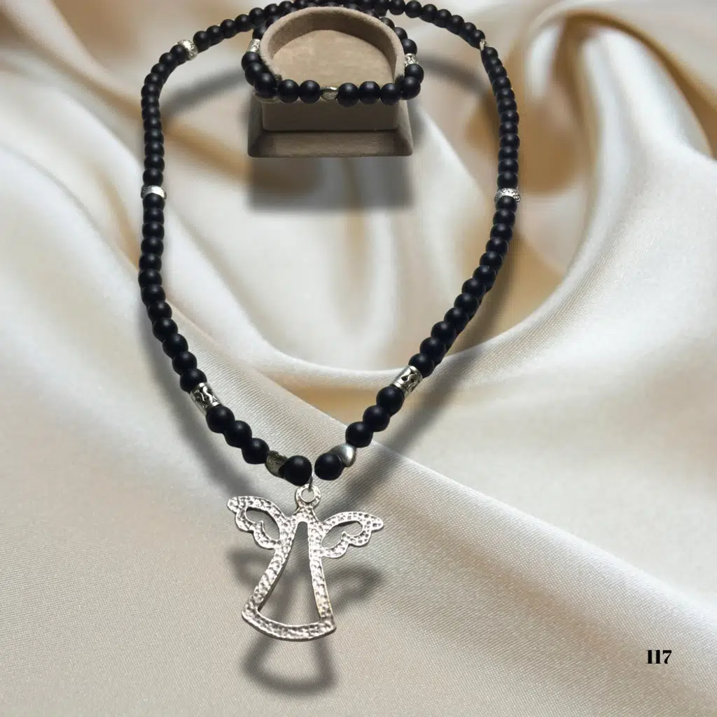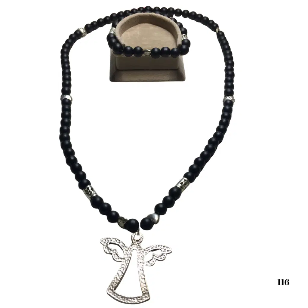 Reina del Corazen El Yapımı Doğal Oniks Taşı Antik Kolye ve Bileklik, tarih boyunca koruyucu tılsım olarak kullanılan oniks taşının güçlü enerjisini zarif ve otantik bir tasarımla birleştiren eşsiz bir settir.